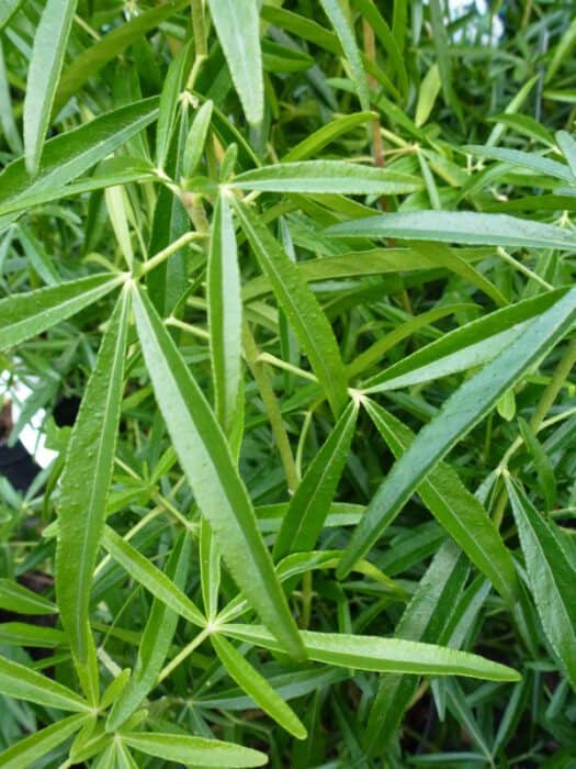 Het langwerpige smalle blad is leerachtig en glanzend en geeft bij kneuzen een heerlijke geur af. Het blad is mooi groen van kleur, de heester is groenblijvend.