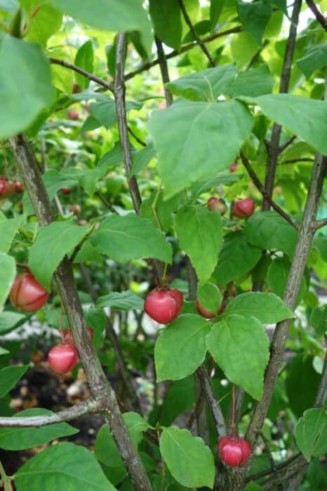 Zeer opvallend en erg mooi zijn de vruchten die in september en oktober verschijnen. De vruchten zijn rood aan de buitenzijde, het zaad is oranje van kleur.
