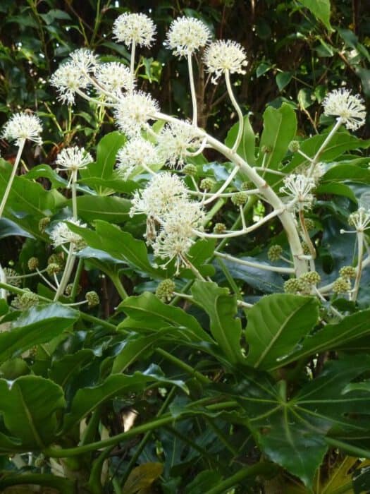 Fatsia japonica bloeit laat in het jaar, als de meeste andere planten in de tuin net beginnen af te sterven en kan 1,5 m tot zelfs wel 4 m hoog worden. De plant heeft een exotische uitstraling vanwege het mooie, glanzende grote blad.