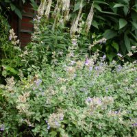 In mijn tuin staat Nepeta faassenii ‘Six Hills Grant’, die bloeit met lavendelkleurige bloemen. Ik heb hem gecombineerd met Geranium Endressii en Zwarte Vlier (zie foto rechts).