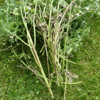 De plant moet na de eerste bloei kort afgeknipt worden, zo stimuleer je een tweede bloei en houdt je de plant in model.Op onderstaande foto’s zie je een nog niet gesnoeide plant, de gesnoeide plant, en wat er weg is geknipt. Je knipt alle houtige plantendelen weg boven de grond op ongeveer 4 cm. De eventueel al gevormde nieuwe takjes kun je laten staan (zie middelste foto).