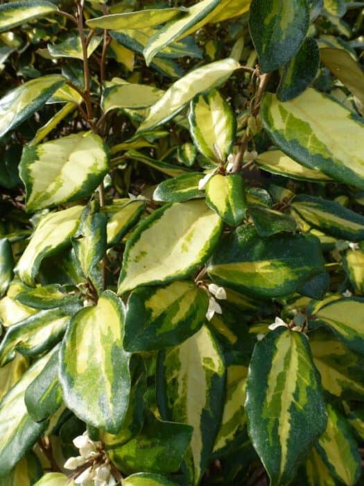 Elaeagnus ebbingei Limelight bloeit met vrij onopvallende witte bloemen laat in het jaar, in oktober en november, en verspreid dan een heerlijke zoete geur.