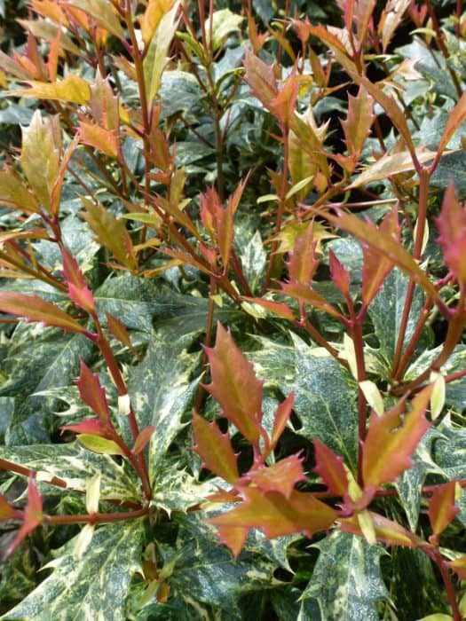 Het blad lijkt op dat van Hulst, en is leerachtig en glanzend en getand. Het groenblijvende blad is bontgekleurd met wit/geel en groen. Het heel jonge blad is rood van kleur.