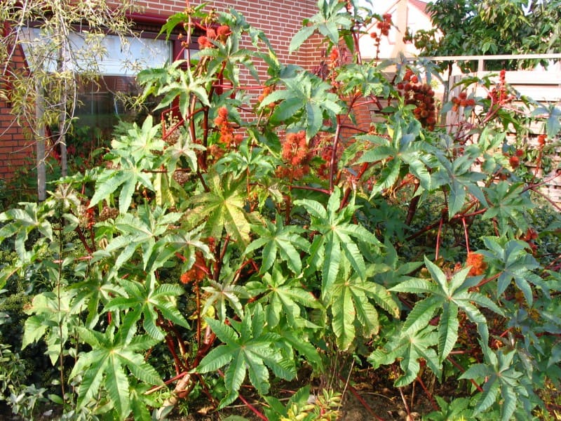 Wonderboom – Ricinus communis is een zeer snelgroeiende plant, die in het Nederlandse klimaat eenjarig is en ongeveer 2 m hoog wordt.