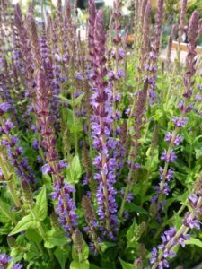 Salvia is een lang- en rijkbloeiende plant die van juni t/m augustus bloeit met blauwpaarse bloemen die in aren boven het blad bloeien.