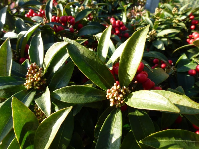 Skimmia’s worden door sommige mensen saai gevonden omdat ze het hele jaar als groene heester in de tuin staan met weinig verandering. Het is echter een prachtige plant die zeker in de winter grote waarde heeft in de tuin! Skimmia’s worden in najaar en winter veel aangeboden in tuincentra vanwege de mooie bessen en bloemknoppen, die kleur geven aan de wintertuin.