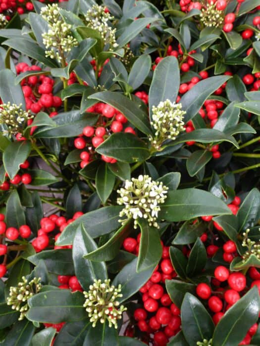 Skimmia japonica Red Diamond is een groenblijvende heester met glanzend donkergroen blad, witte bloemen in het voorjaar en rode bessen in herfst en winter. Lees hier alles over de standplaats, bloei en verzorging van Skimmia.