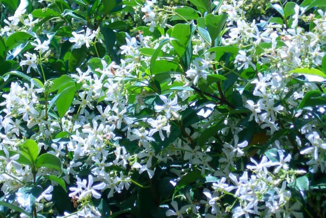 Toscaanse jasmijn of Trachelospermum jasminoides of Sterjasmijn is een rijkbloeiende klimplant met witte geurende bloemen en glanzend donkergroen blad.
